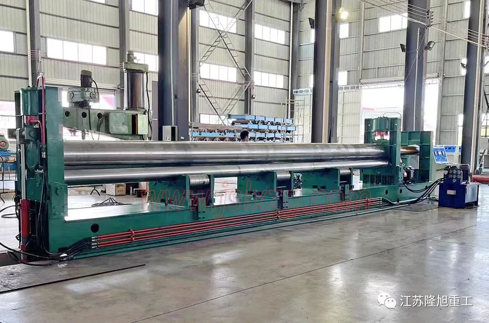 該卷板機屬于液壓型三輥卷板機,上輥可以通過液壓傳動垂直升降。下輥由電機、減速機帶動進行卷圓。由于下輥的標高不變,所以便于進料和操作。設備采用PLC可編程顯示器控制,運行平穩、靈活,無卡阻。該設備輥面還采用了鍍鉻工藝,更適合卷制不銹鋼罐體。